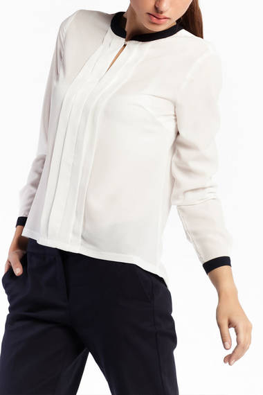 Легкая блуза из белой шелковистой ткани с черной окантовкой на манжетах и по горловине. Впереди несколько вертикальных драпировок и застежка на пуговицу.