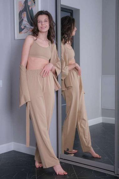 Хлопковый трикотаж премиум-класса, не скатывается и не садится при стирке. В серии Home идеально сочетаются топ, кимоно и брюки. Вы можете выбрать все позиции в одном оттенке или поиграть с сочетанием различных цветов.